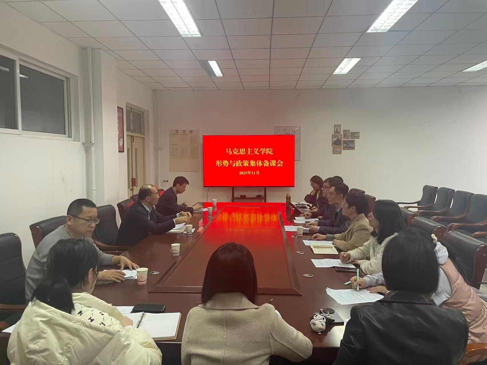 2025年11月12日下午4点半,校长孔伟金参加马克思主义学院“形势与政策”教研室集体备课会,与教师们共同研讨如何将党的二十届四中全会精神融入思政课教学。