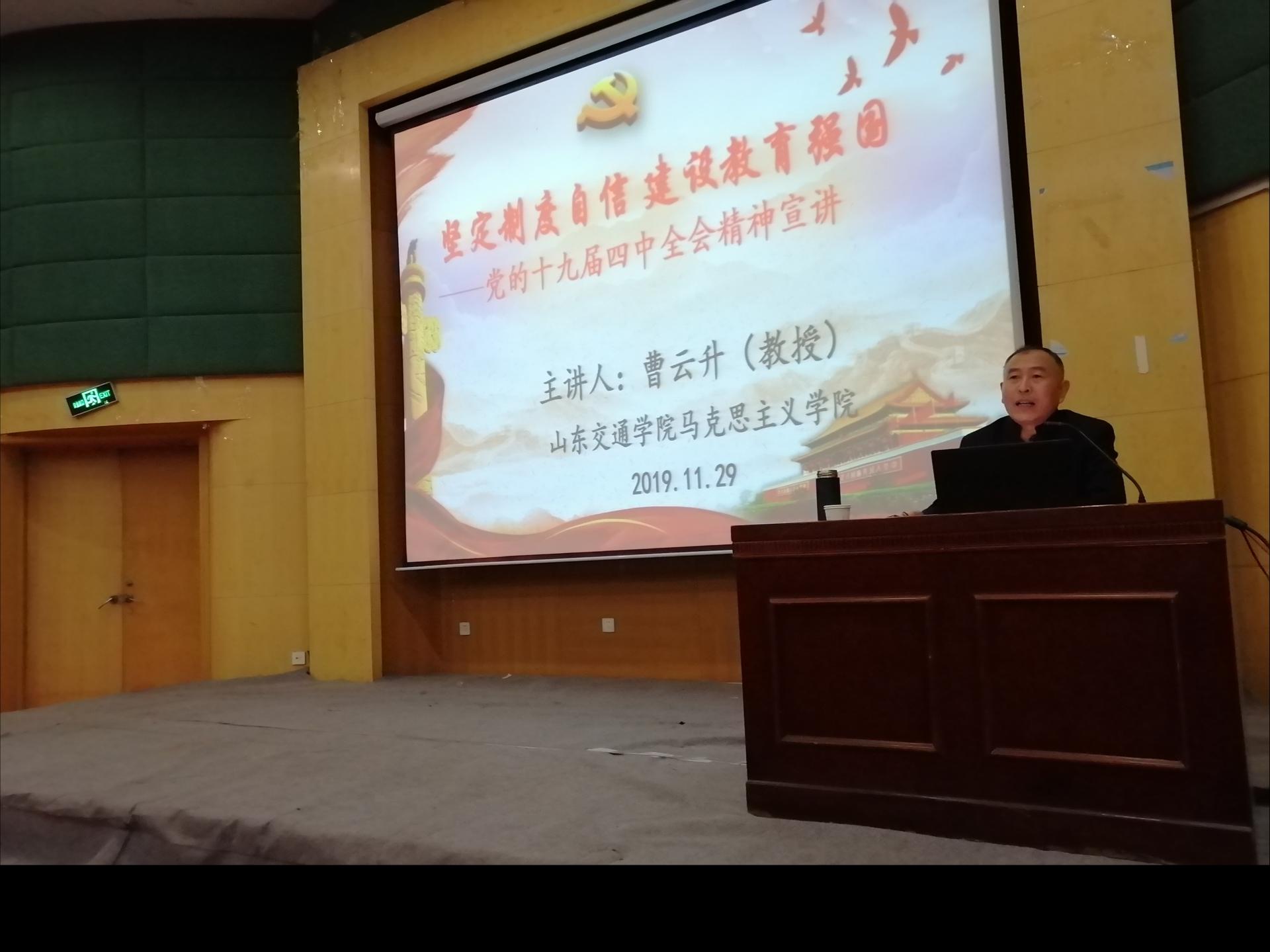 11月29日,我校党的十九届四中全会精神宣讲报告会在无影山校区学术报告厅举行,中共山东省委宣讲团成员、我校马克思主义学院曹云升教授作了题为《坚定制度自信,建设教育强国》的主题报告。来自党委学生工作部(处)、交通土建工程学院、经济与管理学院的300余名师生聆听报告会。
